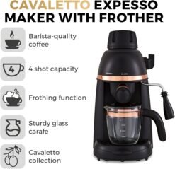 Tower T13014RG Cavaletto Espresso Maker with Frothing Function. Glass Carafe. Steel Filter. 800 W.4 cups. Black and Rose Gold