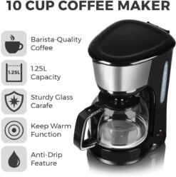 Tower T13001 Filter Coffee Machine. 10 Cup Serving with Keep Warm Function and Water Gauge. 1.25L. 1000W. Black & Silver