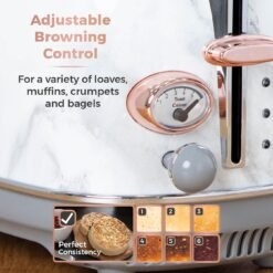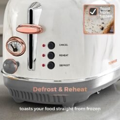 Designed with contemporary White Marble exterior and Rose Gold browning control and leaver for a stylish finish on your worktop. The variable width slots accommodate bread slices of different sizes. with a self-centering function to ensure even coverage. The controls allow you to cancel toasting at any time. with a reheat and defrost function you can toast straight from the freezer. The removable crumb tray and cable storage help to dispose of mess easily and keep your worktop tidy.