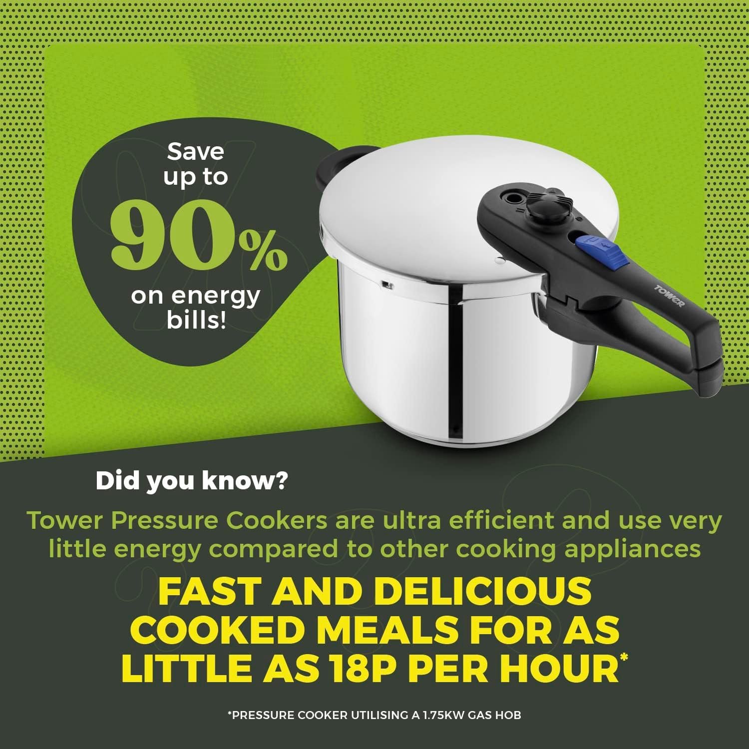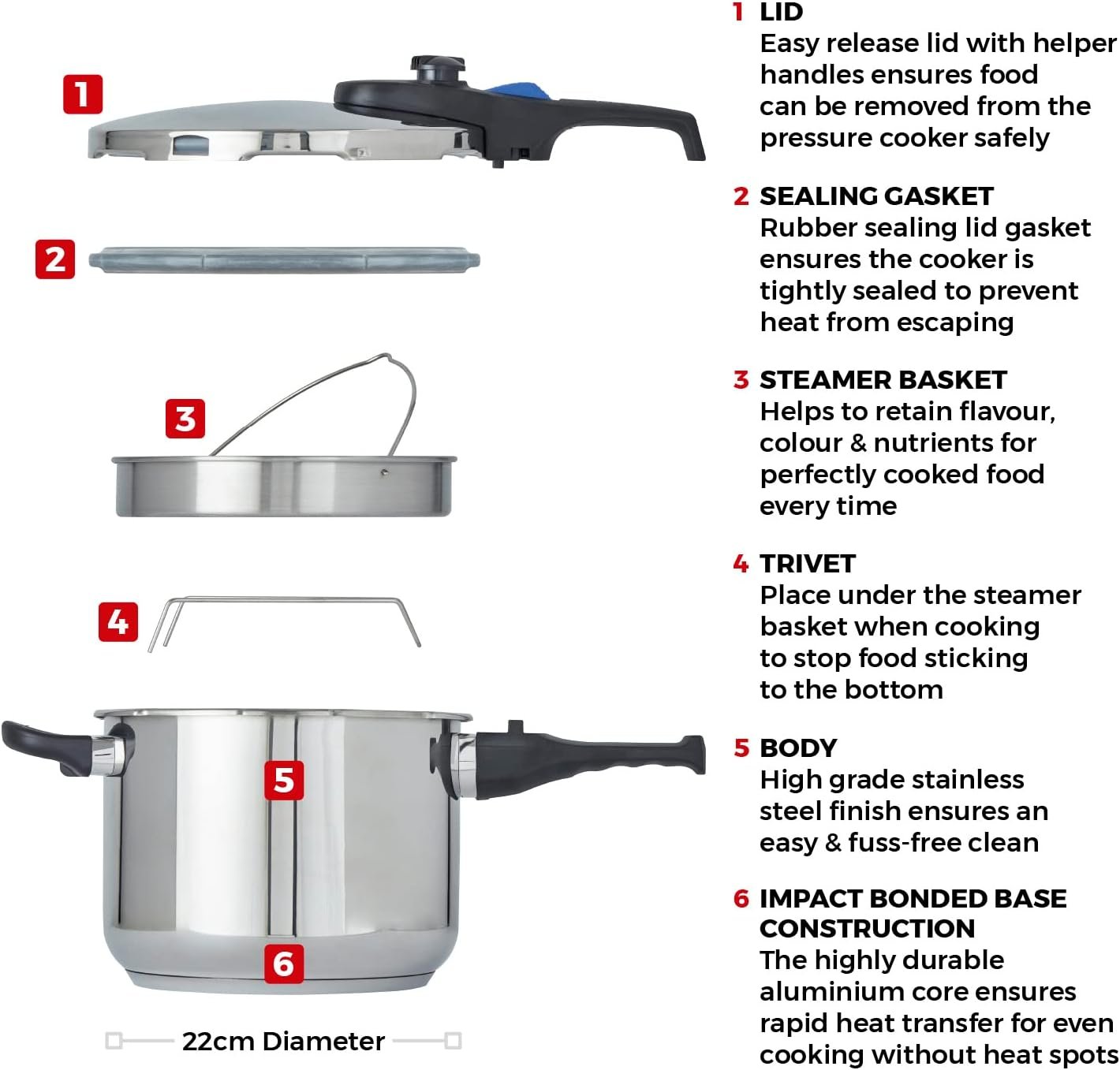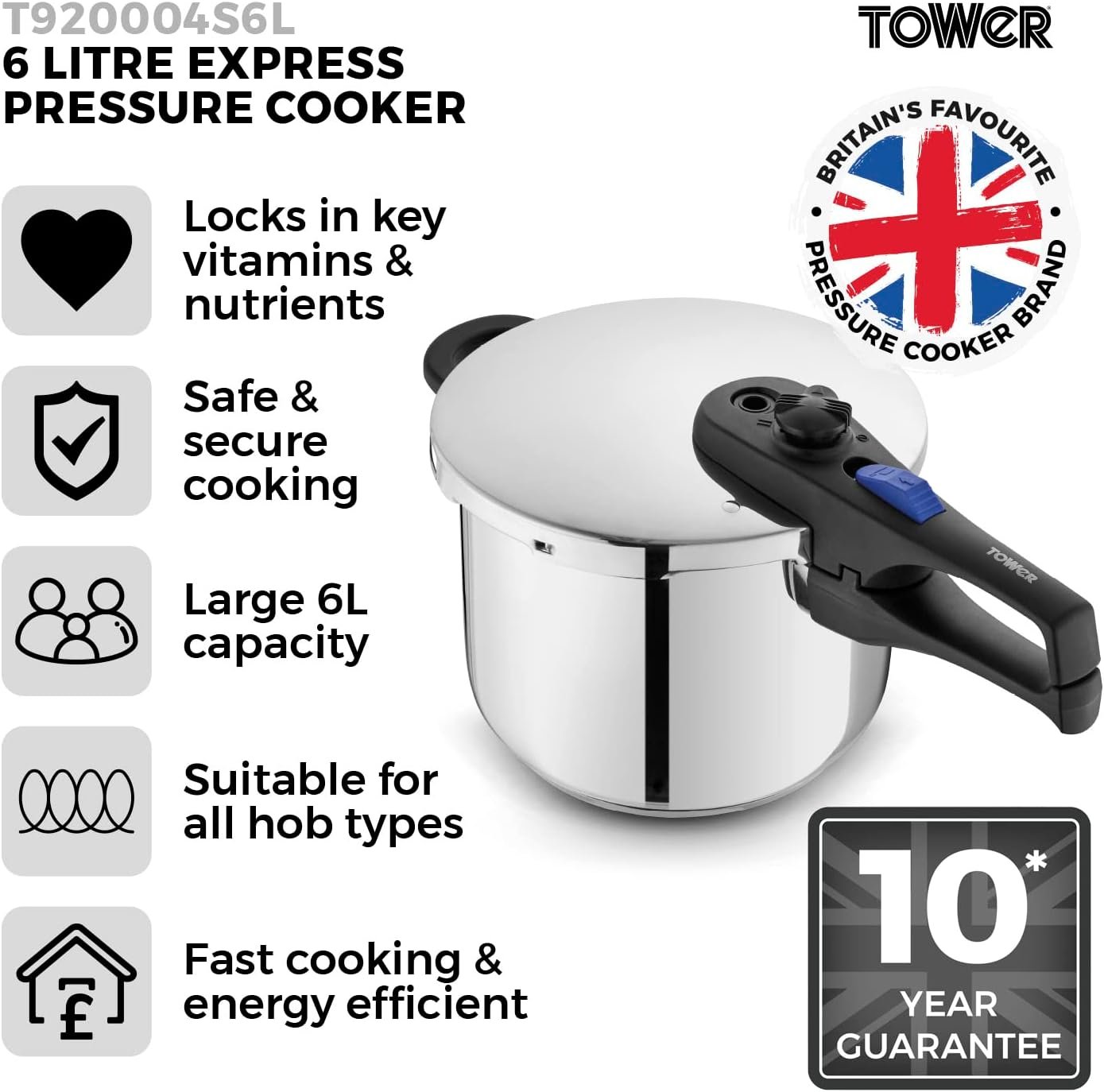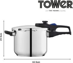 Tower Express Pressure Cooker with Bakelite Lid Lock System. Visual Pressure Indicator. 6L. Stainless Steel