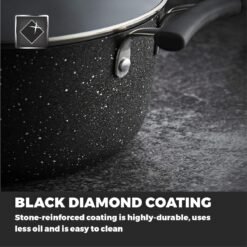 - BLACK DIAMOND COATING: Stone-reinforced coating is 7 times stronger than standard non-stick coating. requiring little or no oil for healthier cooking