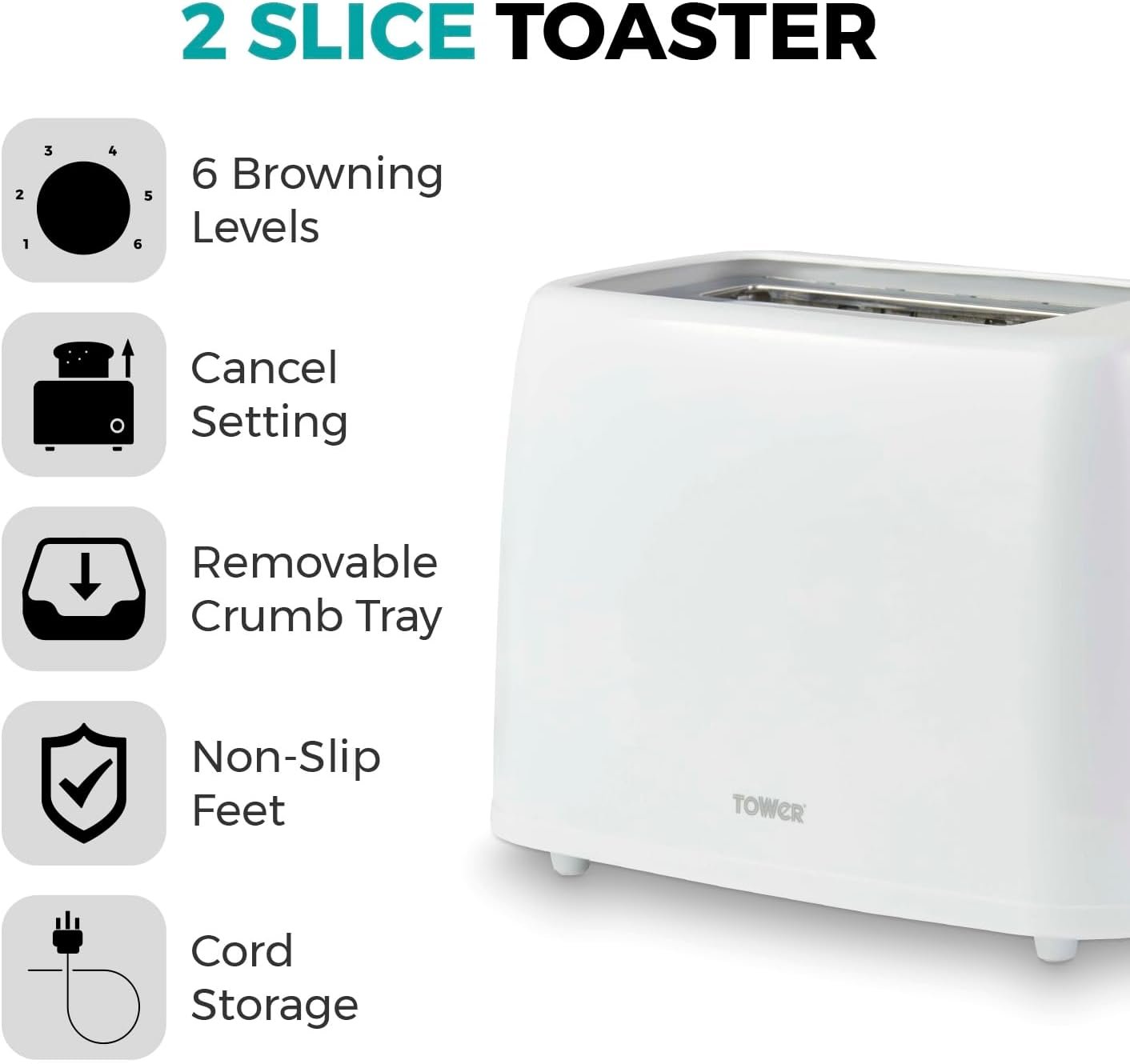 Enjoy your toast. crumpets and bagels exactly how you like them with the Tower 2-slice toaster. Featuring 6 browning settings. it gives you more control over the toasting time so you can select the right texture to suit your taste. Complete with an anti-jam function to prevent toast. bagels and other snacks from getting stuck. the toaster requires a simple wipe clean with a damp cloth to keep it in pristine condition.