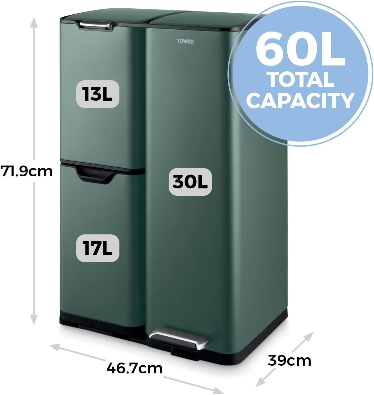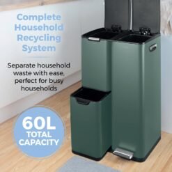- COMPLETE HOUSEHOLD RECYCLING SYSTEM: With a spacious 60L capacity. this bin provides the ideal all-round recycling system. Perfect for a busy household. the three different compartments will let you separate your waste with ease for simple & fuss-free recycling & waste disposal
