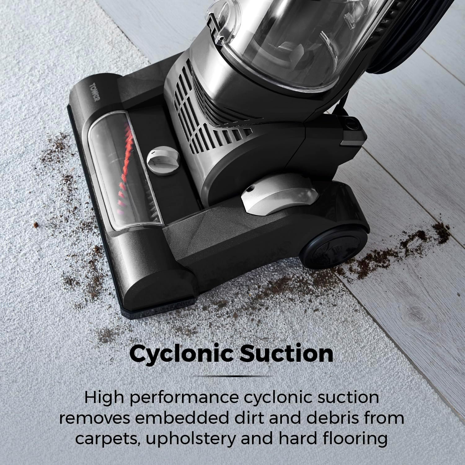 - CYCLONIC SUCTION: With an intense 750W output. the powerful enhanced cyclonic suction effortlessly removes debris and deep embedded dirt. producing fresh and clean carpets. upholstery and hard flooring for versatility