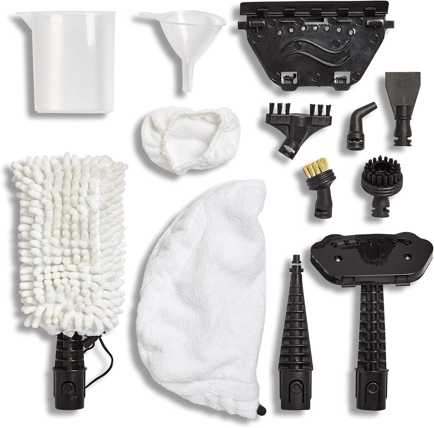 - Includes 16 accessories: 2 microfibre cloths. carpet glide. brush tool. large and small brush. blinder. coral cloth. scraper. steamer cloth. accessories adaptor. squeegee attachment. angled nozzle. funnel and cup.