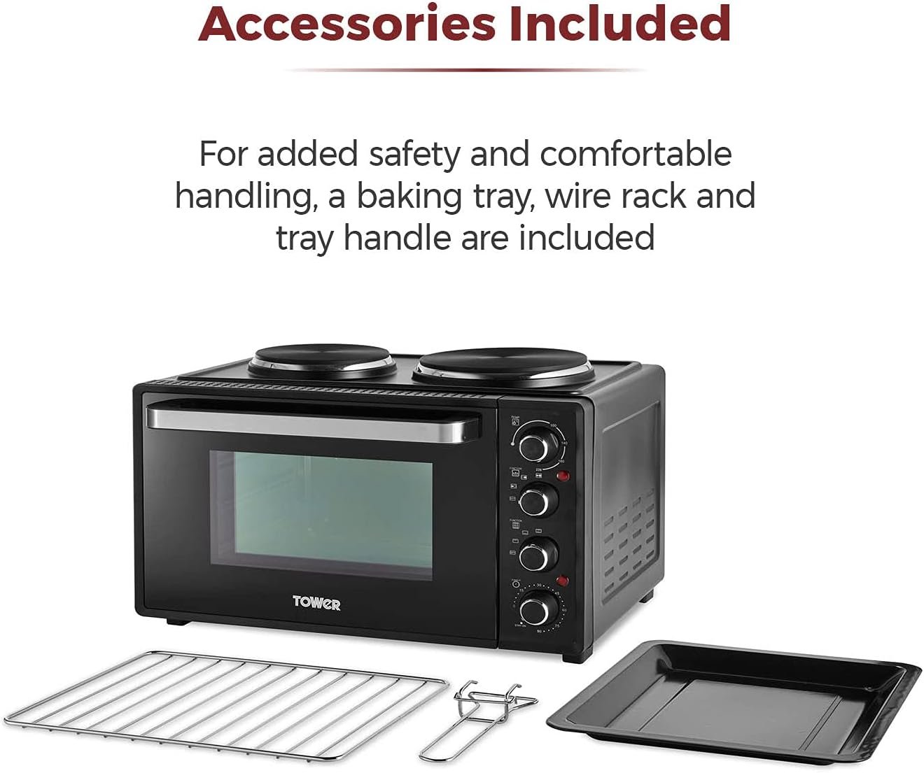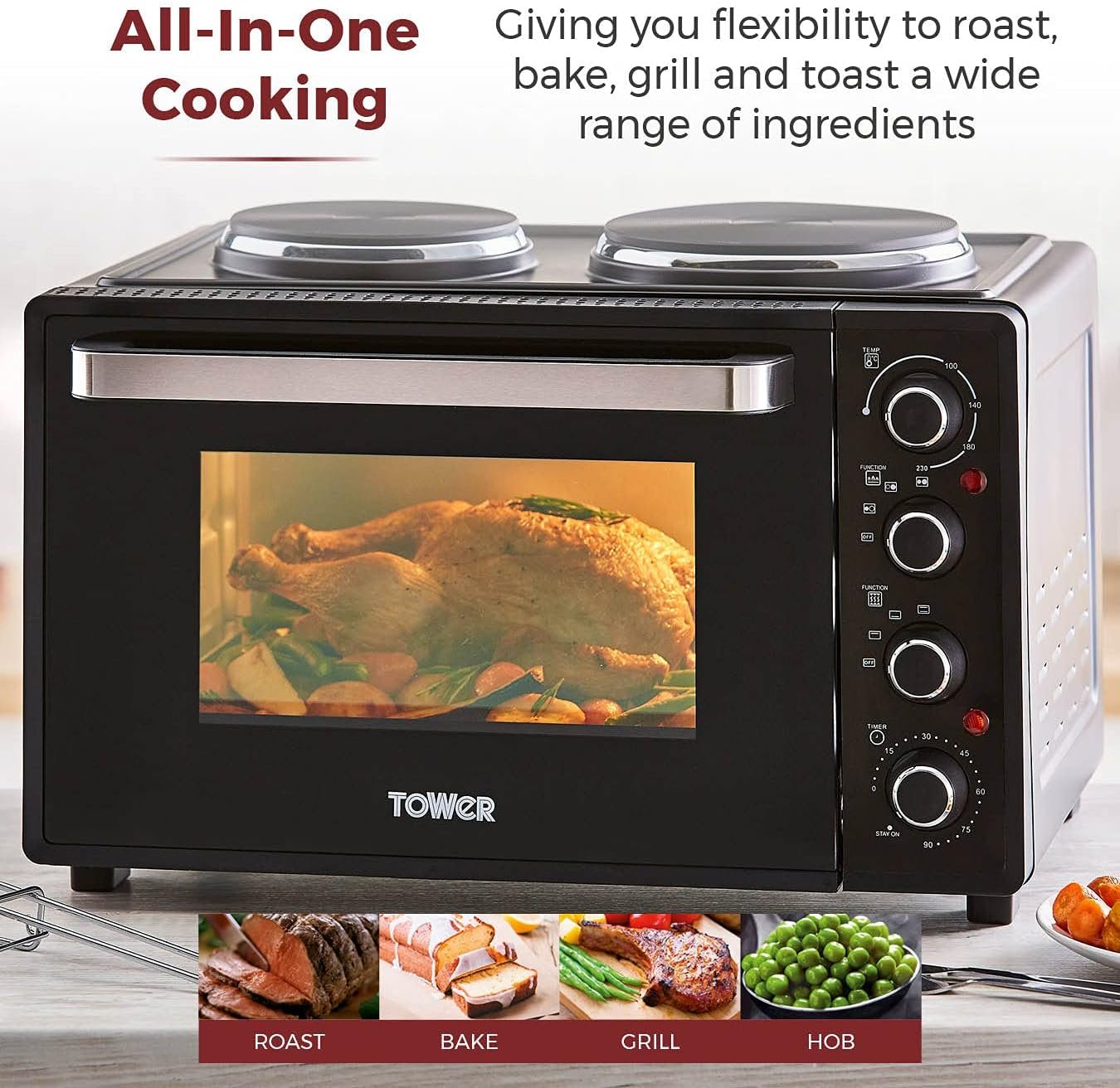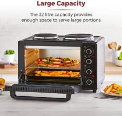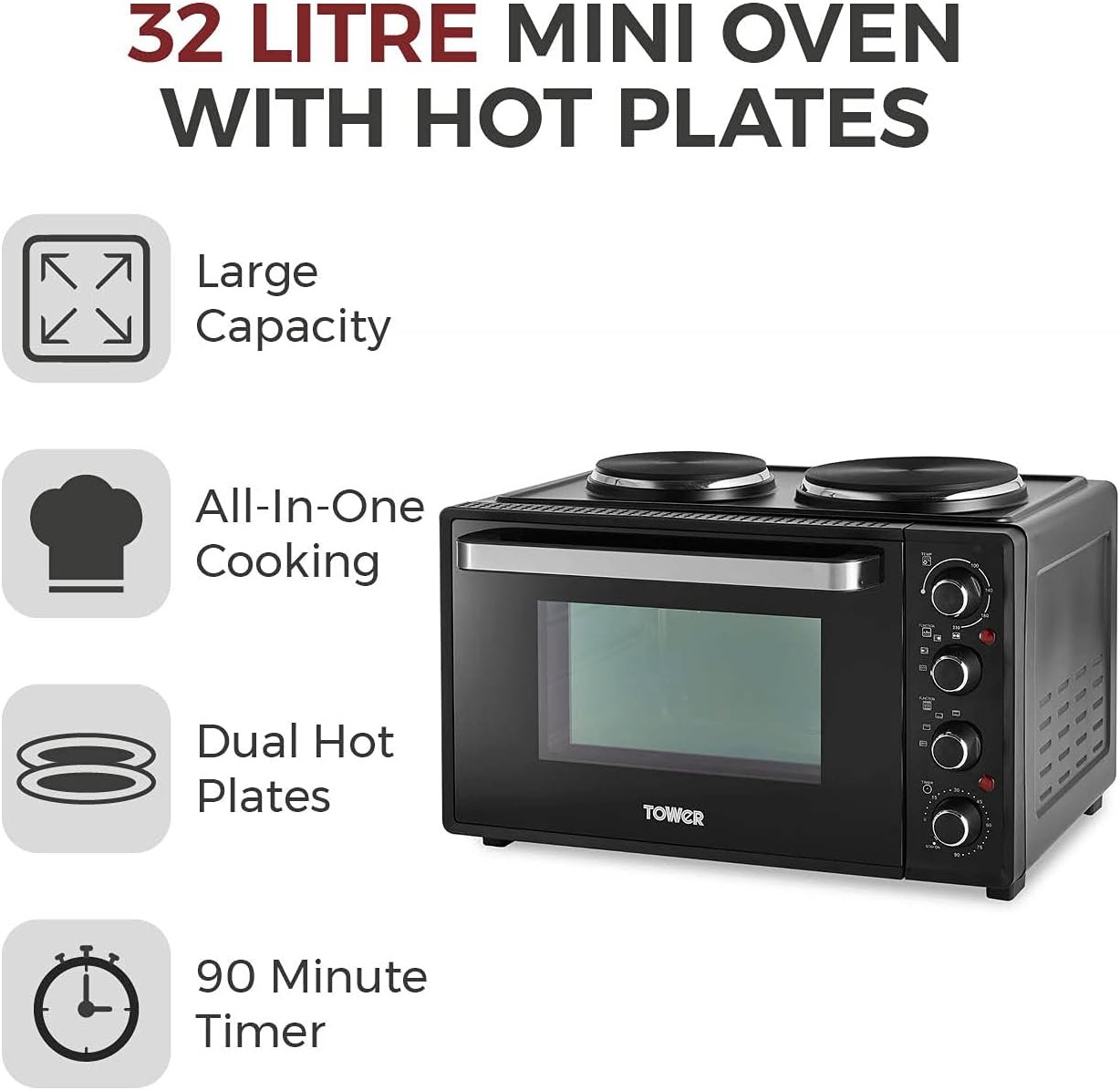 Cook with convenience using this compact Tower 32 litre mini oven. You can roast and bake a wide range of delicious meals. including chicken. chips and cake just by turning the easy to use dials. Dual hot plates. 600W and 1000W. let you cook casseroles and fried foods for versatility.