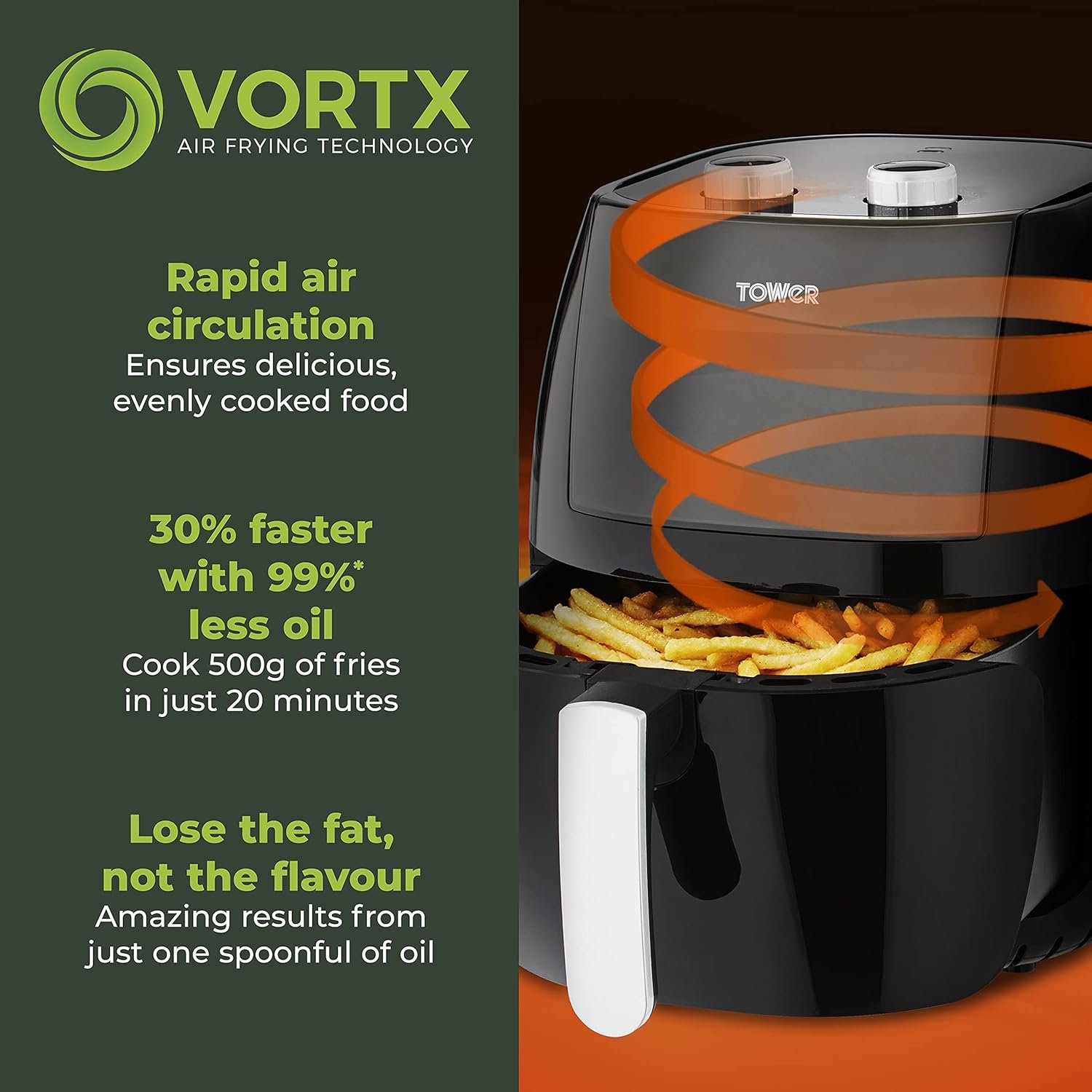 - VORTX AIR FRYING TECHNOLOGY: Exclusive to Tower Air Fryers. Vortx technology rapidly circulates hot air around food. cooking up to 30% faster than a conventional oven. Vortx also cooks food with little or no oil. making it much healthier. too! Lose the fat not the flavour with Vortx Air Frying Technology