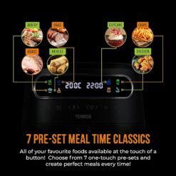 Exclusive to Tower Air Fryers. Vortx technology rapidly circulates hot air around food. Cooking up to 30% faster than a conventional oven and using 99% less oil. saving up to 70% on your energy. A clear. easy to read coloured display ensures simple and efficient cooking. with different coloured icons to help choose between the different cooking pre-sets. Choose from 7 one-touch pre-sets to take the guesswork out of cooking. including Air Fry. Bake. Cupcake. Fries. Roast. Chicken & Roast.