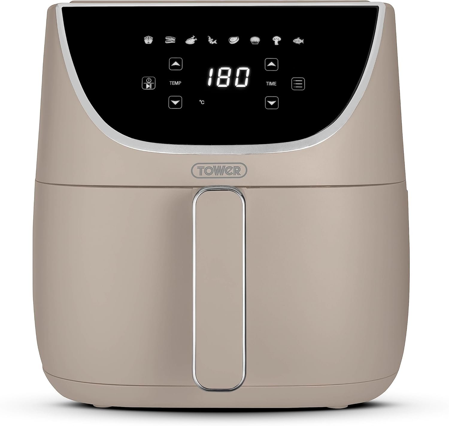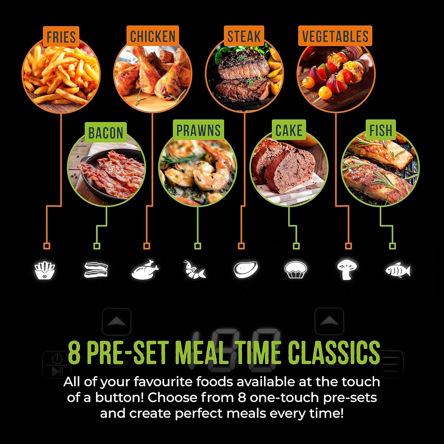 - DIGITAL TOUCH PANEL & 8 COOKING PRESETS: All of your cooking options at the touch of a button. Set the timer for up to 60 minutes. the temperature ranges between 80-200C or choose from 8 cooking pre-sets. Choose from. Fries. Bacon. Drumsticks. Prawns. Steak. Cake. Veg & Fish