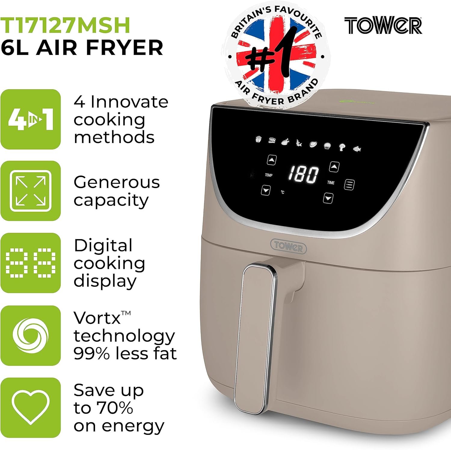 - SAVE UP TO 70% ON ENERGY: Tower Air Fryers are powerful and cook food much faster than conventional ovens. yet they also use far less energy. Save up to 70% on your energy by simply switching to Tower Air Fryer cooking.