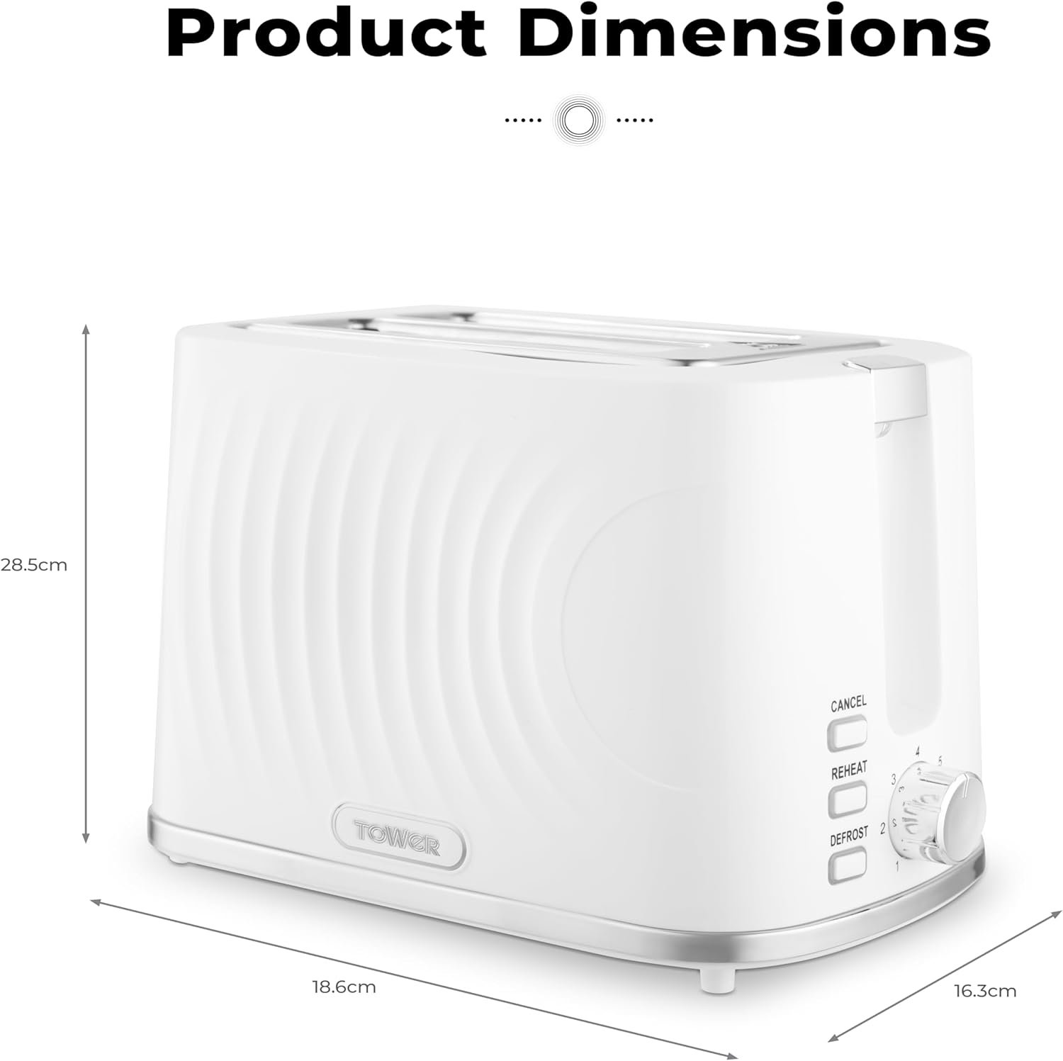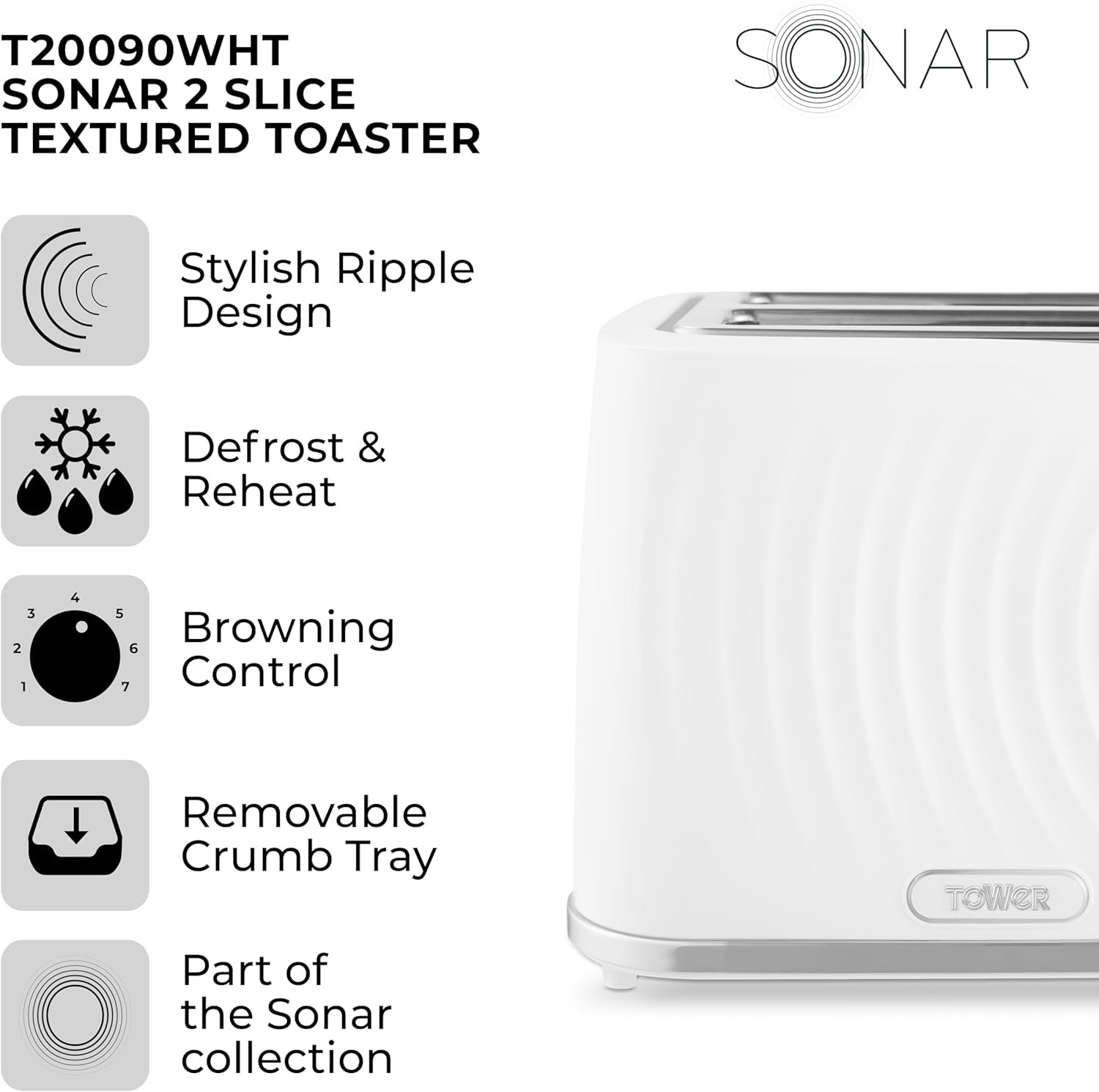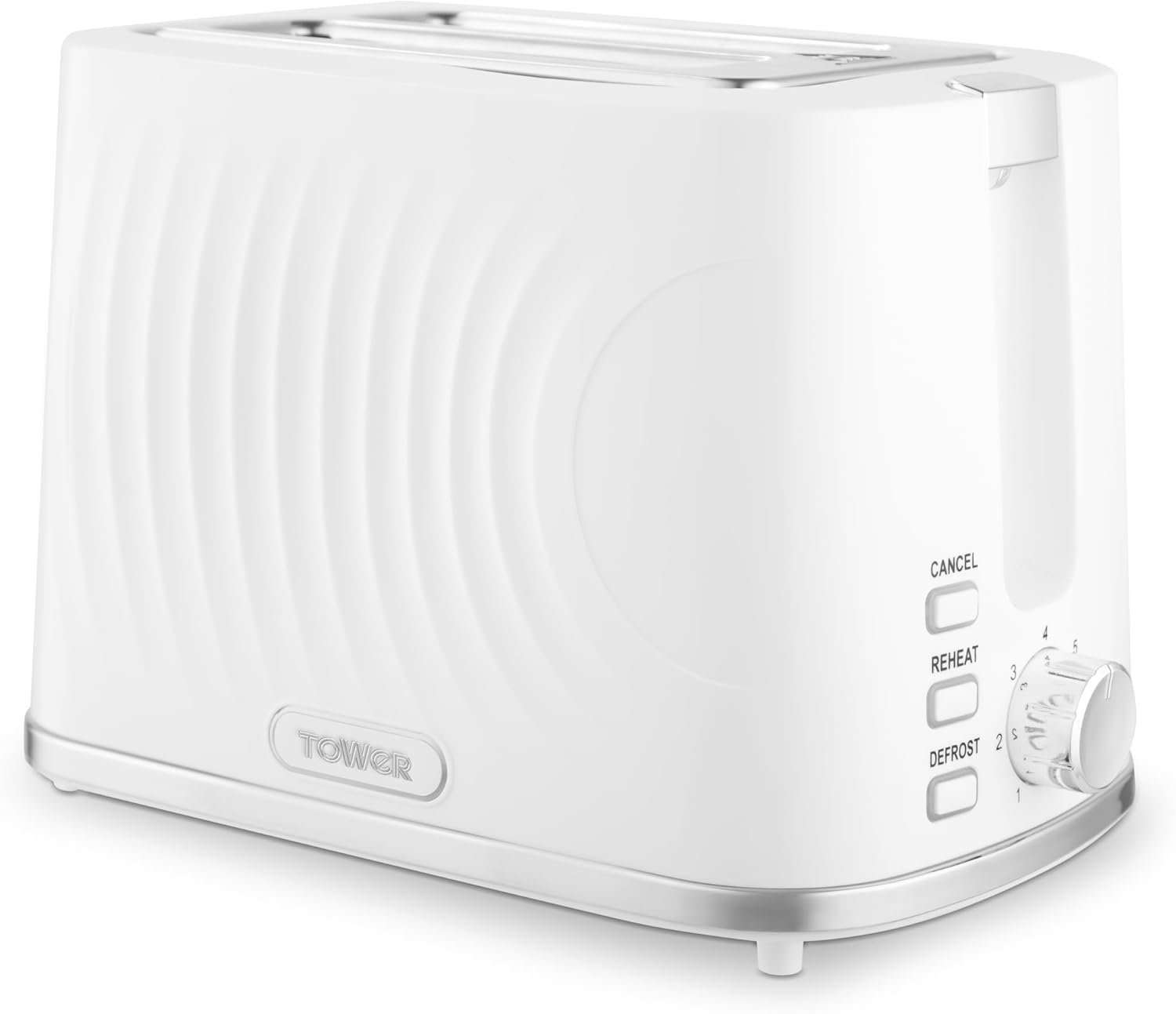 This 2-slice Toaster from Tower brings modern style to the kitchen The 7 browning levels allow you to create toast that suit your tastes and make family breakfasts simple. Complete with defrost. reheat and cancel functions. you can cook from frozen. warm up any forgotten slices and cancel whenever it suits you. The self-centring function keeps each slice aligned to the middle of slots for even toasting on both sides. with a removable crumb tray that minimises mess.