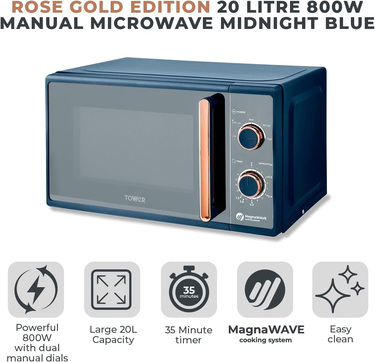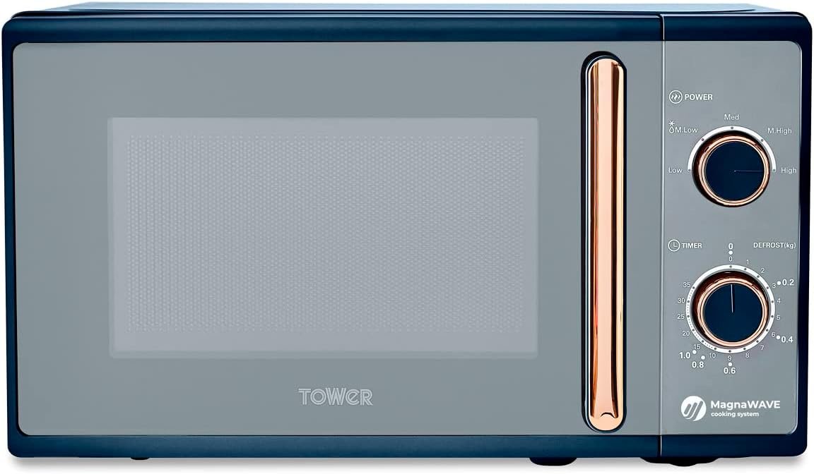 Tower T24038MNB Cavaletto Manual Microwave with 5 Power Levels and 35 Minute Timer. 800W. 20L. Midnight Blue & Rose Gold