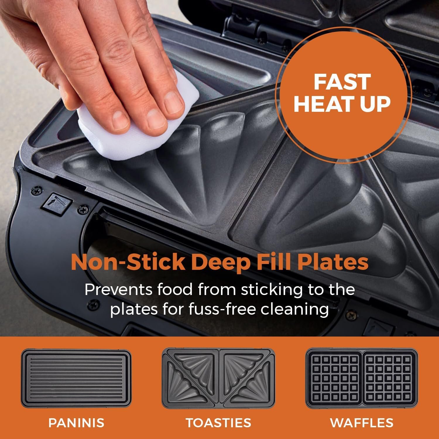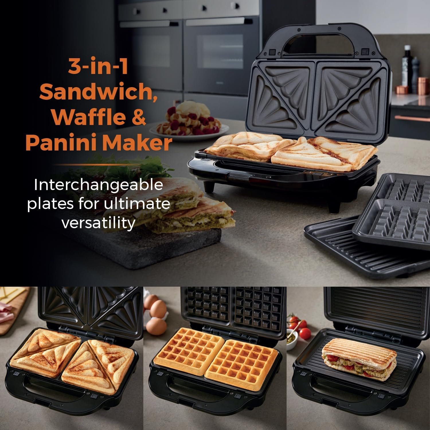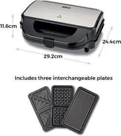 - 3-IN-1 PLATES – interchangeable plates offer complete versatility. letting you make sandwiches. waffles and grill to create a range of delicious snacks