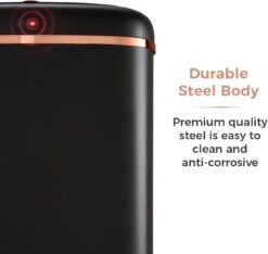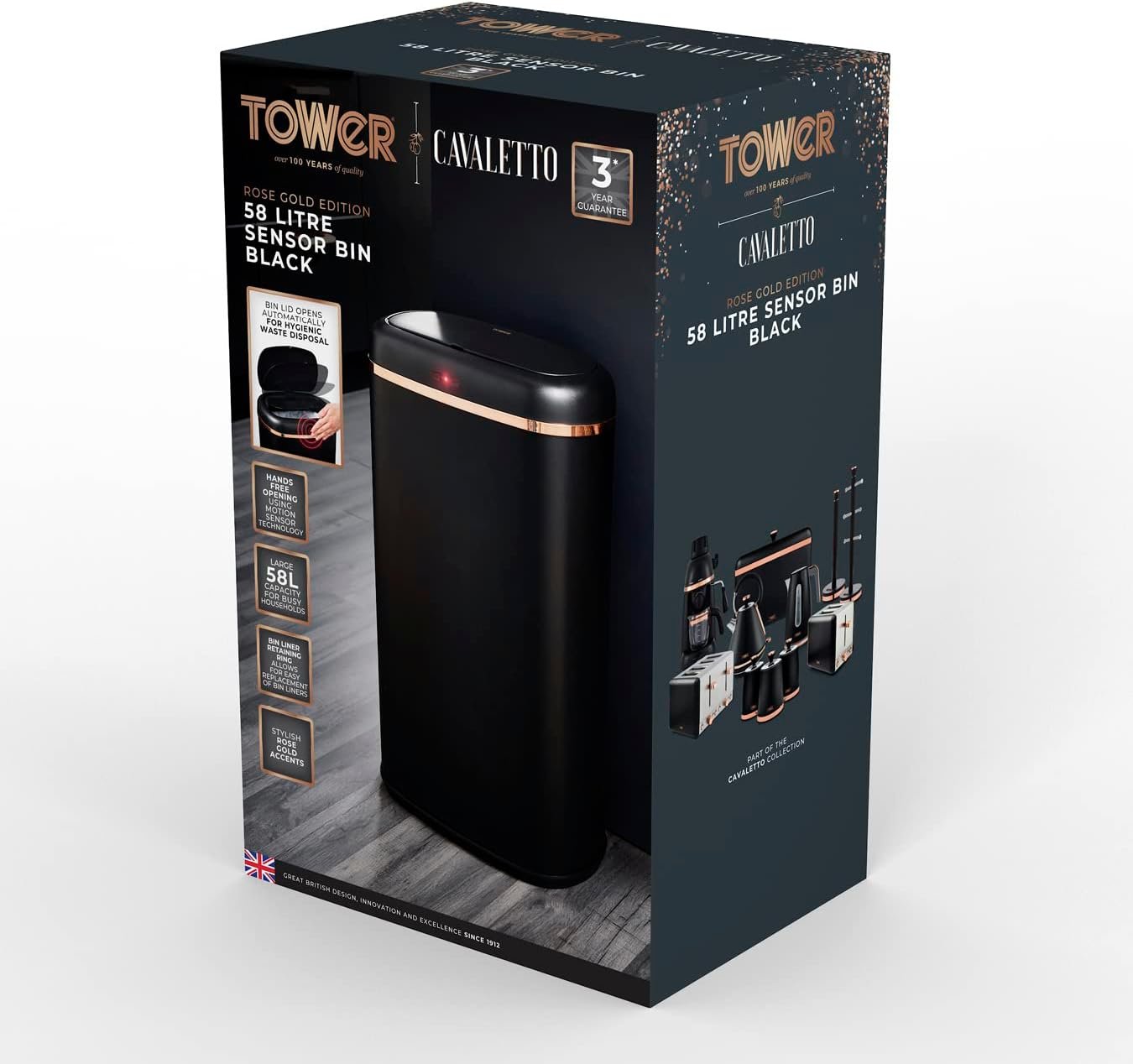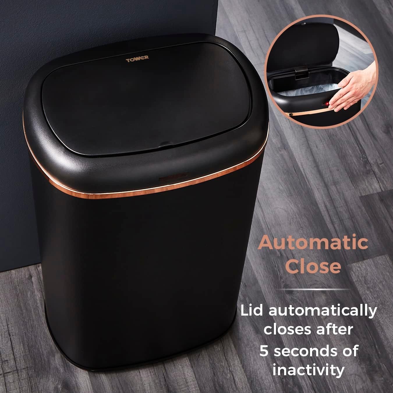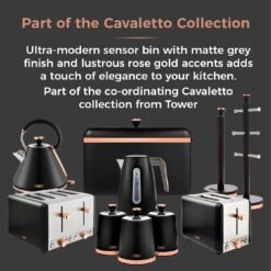 Hygienically dispose of household waste with the 58L Tower Square Sensor Bin. featuring touch-free opening with one hand motion. The robust stainless steel body ensures a long-lasting reliable kitchen essential without compromising on style. The automatic closing lid gets to work after 5 seconds of inactivity to lock in any unwanted odours. The ultra-modern matte black finish and lustrous rose gold accents adds a touch of elegance to your kitchen. Part of the Cavaletto collection from Tower.