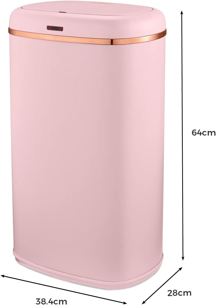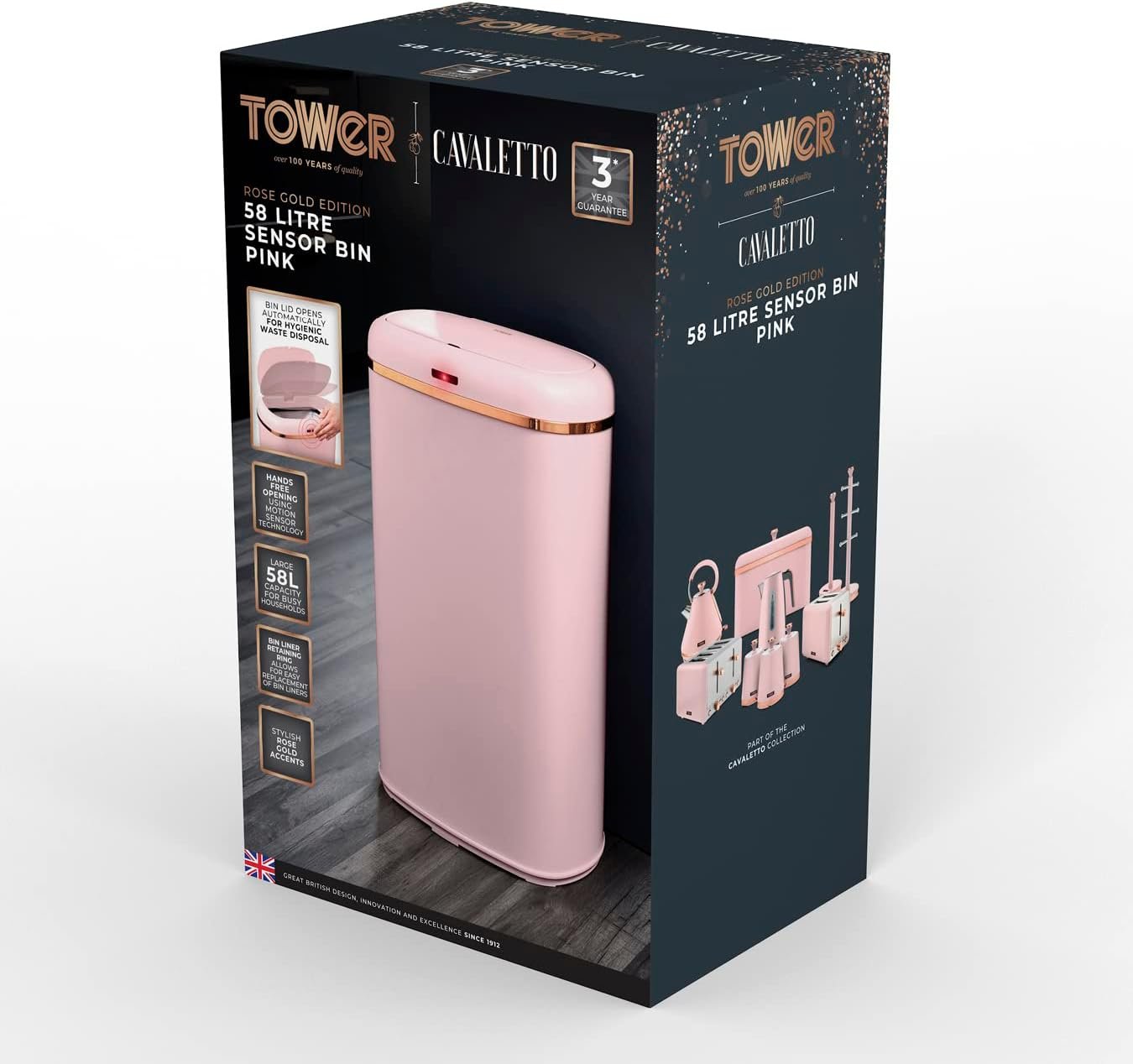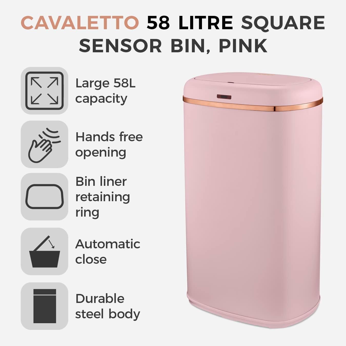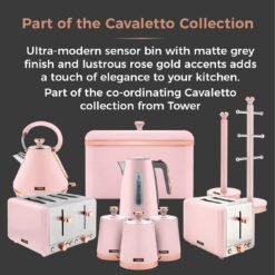Hygienically dispose of household waste with the 58L Tower Square Sensor Bin. featuring touch-free opening with one hand motion. The robust stainless steel body ensures a long-lasting reliable kitchen essential without compromising on style. The automatic closing lid gets to work after 5 seconds of inactivity to lock in any unwanted odours. The ultra-modern matte pink finish and lustrous rose gold accents adds a touch of elegance to your kitchen. Part of the Cavaletto collection from Tower.