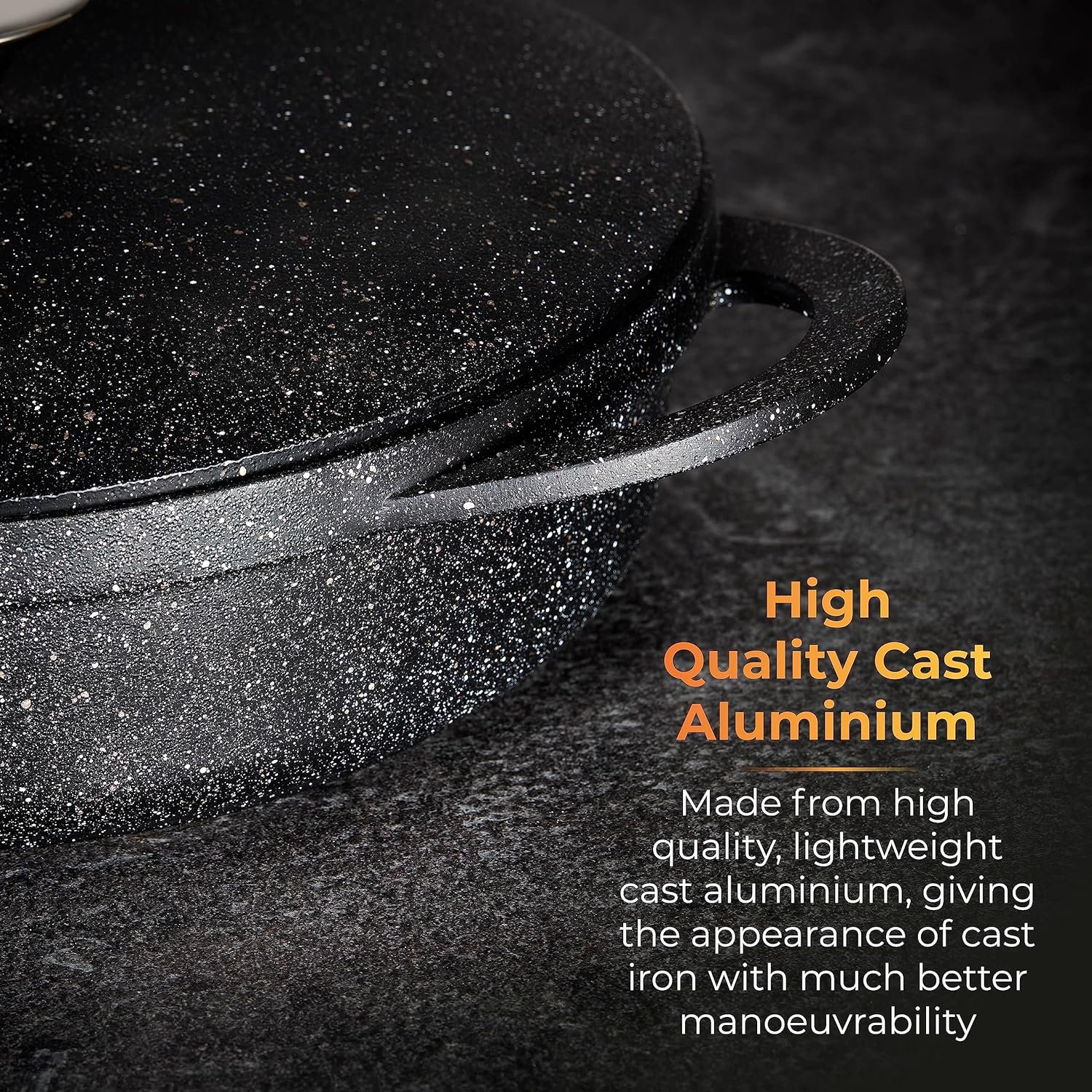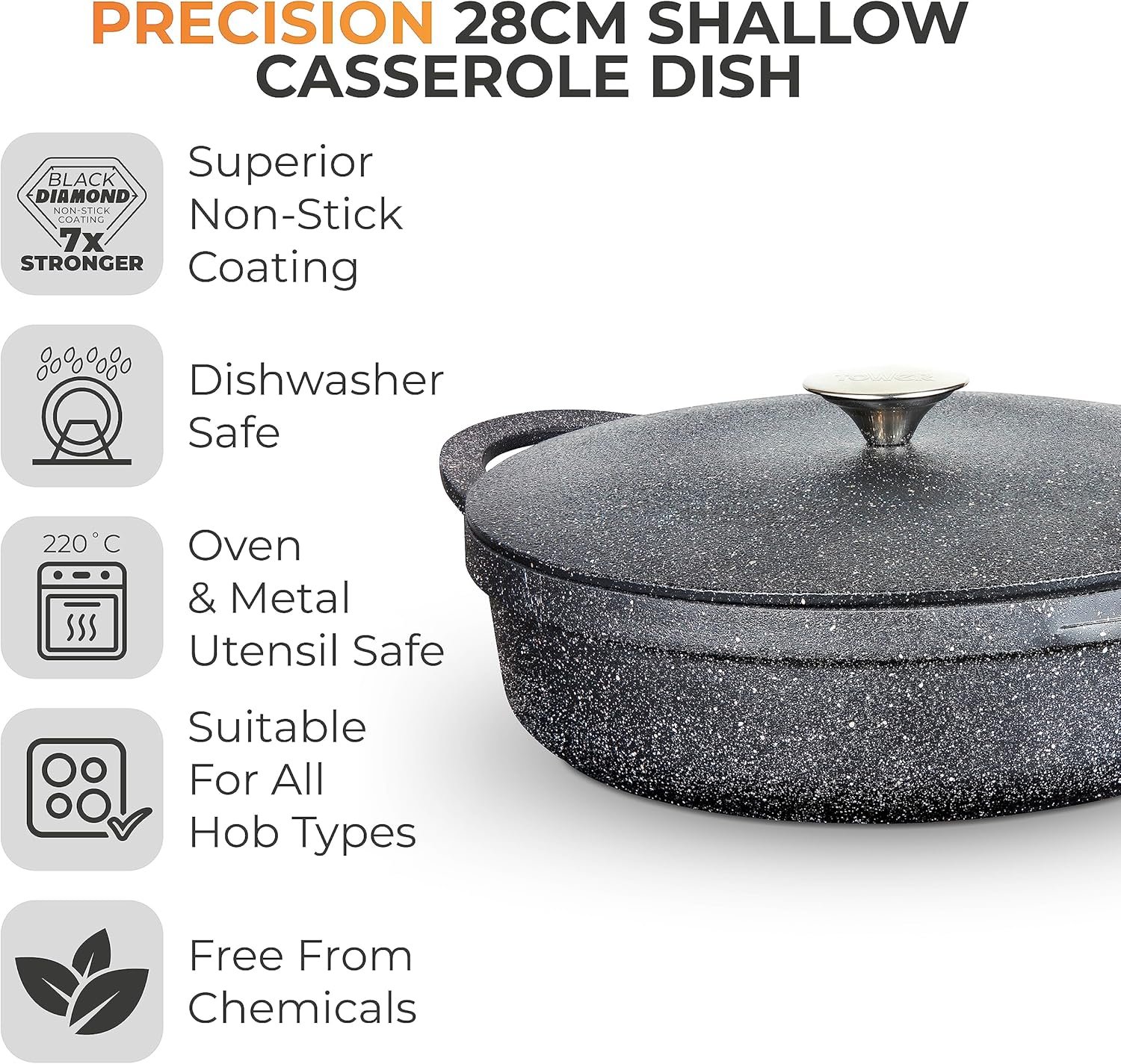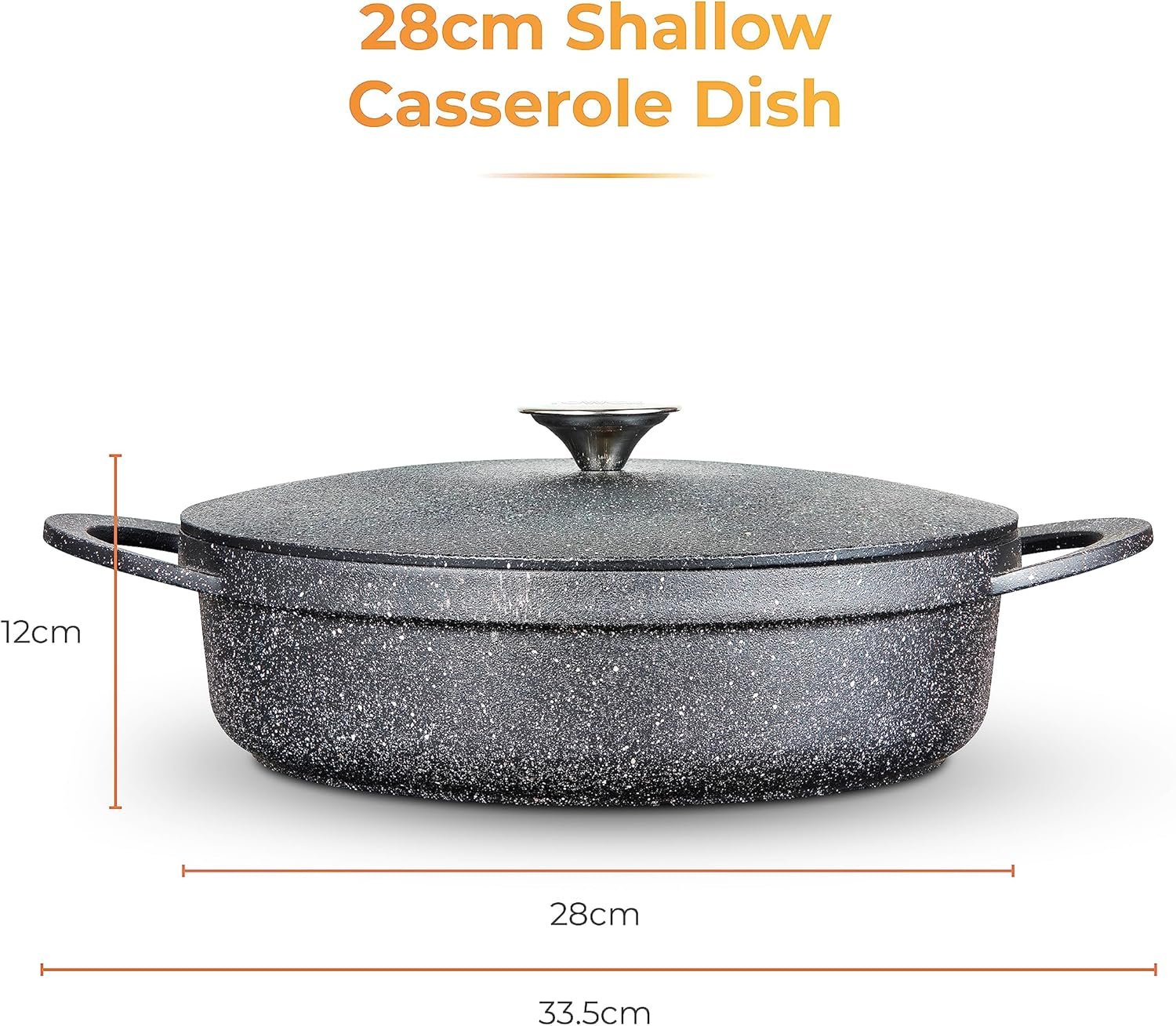 - HIGH QUALITY CAST ALUMINIUM: 28cm Shallow Casserole dish made from high quality. lightweight cast aluminium. giving the appearance of cast iron with much better manoeuvrability
