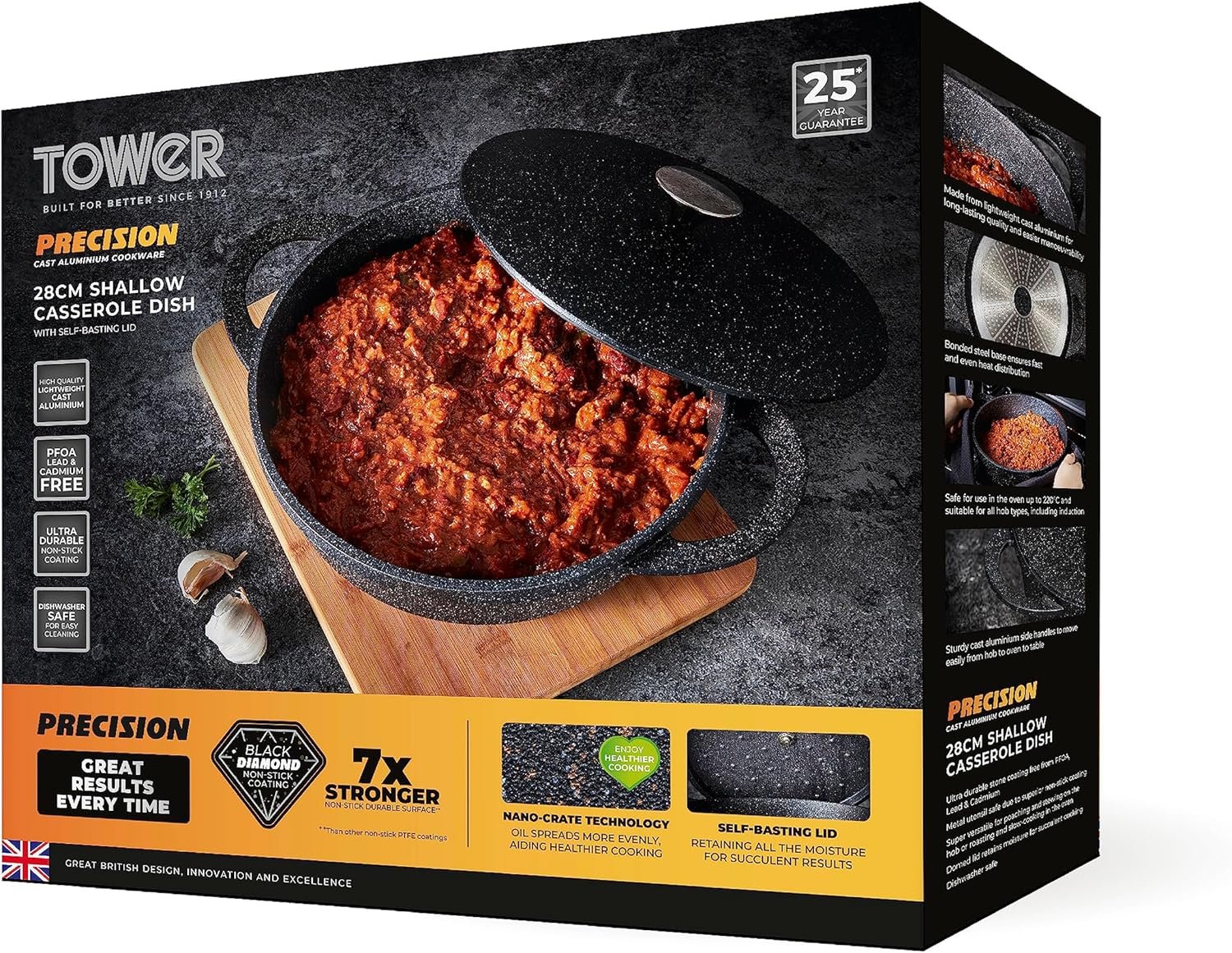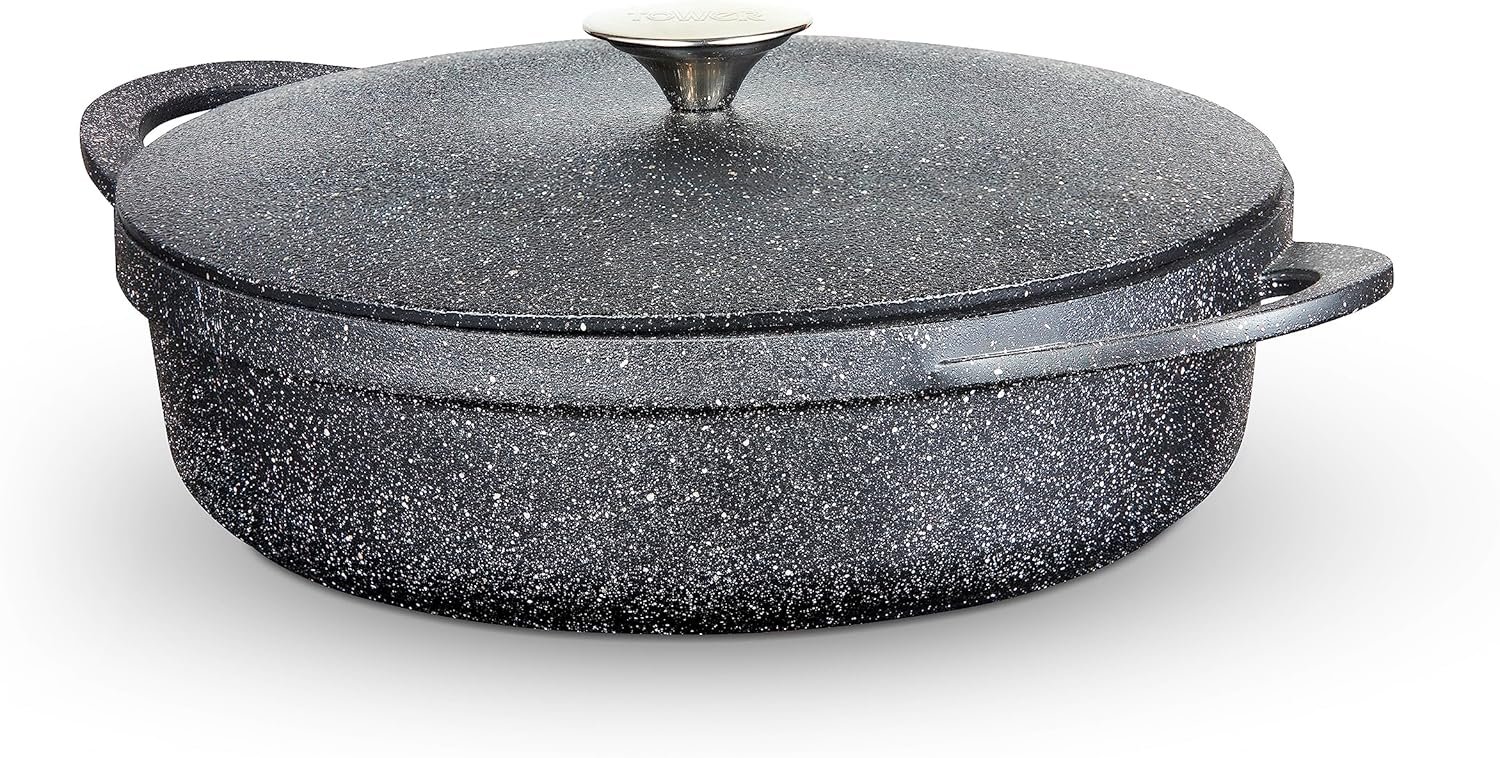 Tower T900191 Shallow Casserole Dish with Aluminium Lid. Lightweight Cast Aluminium. 28cm. Black