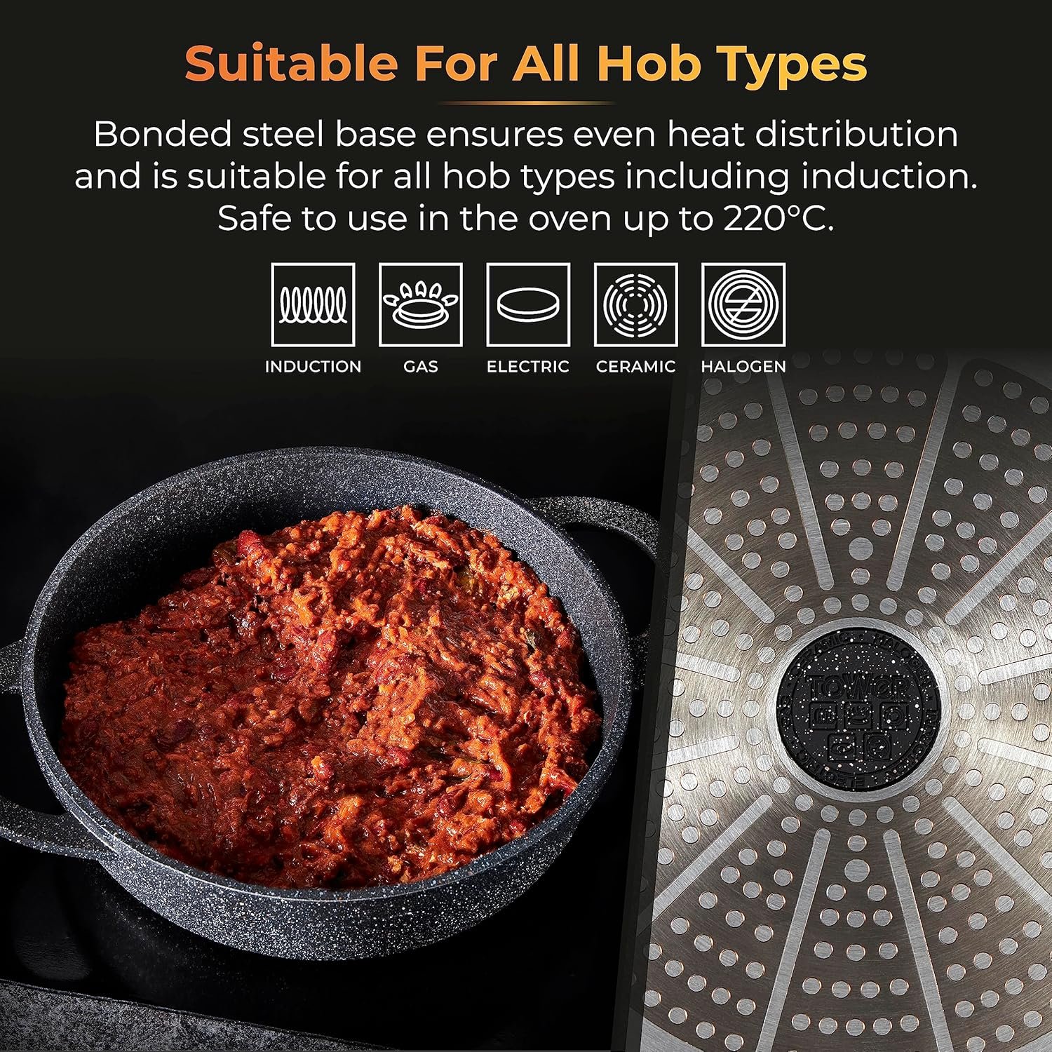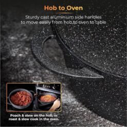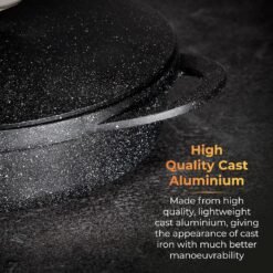 28cm Shallow Casserole dish made from high quality. lightweight cast aluminium. giving the appearance of cast iron with much better manoeuvrability