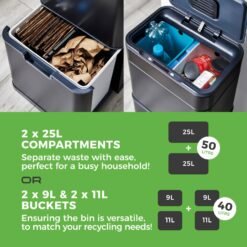 - 50L COMPLETE RECYCLING SYSTEM: Two 25L compartments separate waste with ease. perfect for a busy household. Using two 9L and two 11L buckets you can convert it into a 40L recycling system. ensuring the bin is versatile to match your recycling needs. Divided into two sections. the two 9L compartments are inside the top of the bin whilst the two 11L compartments can be pulled out from the bottom. whilst there will also be one 25L bucket in each section.