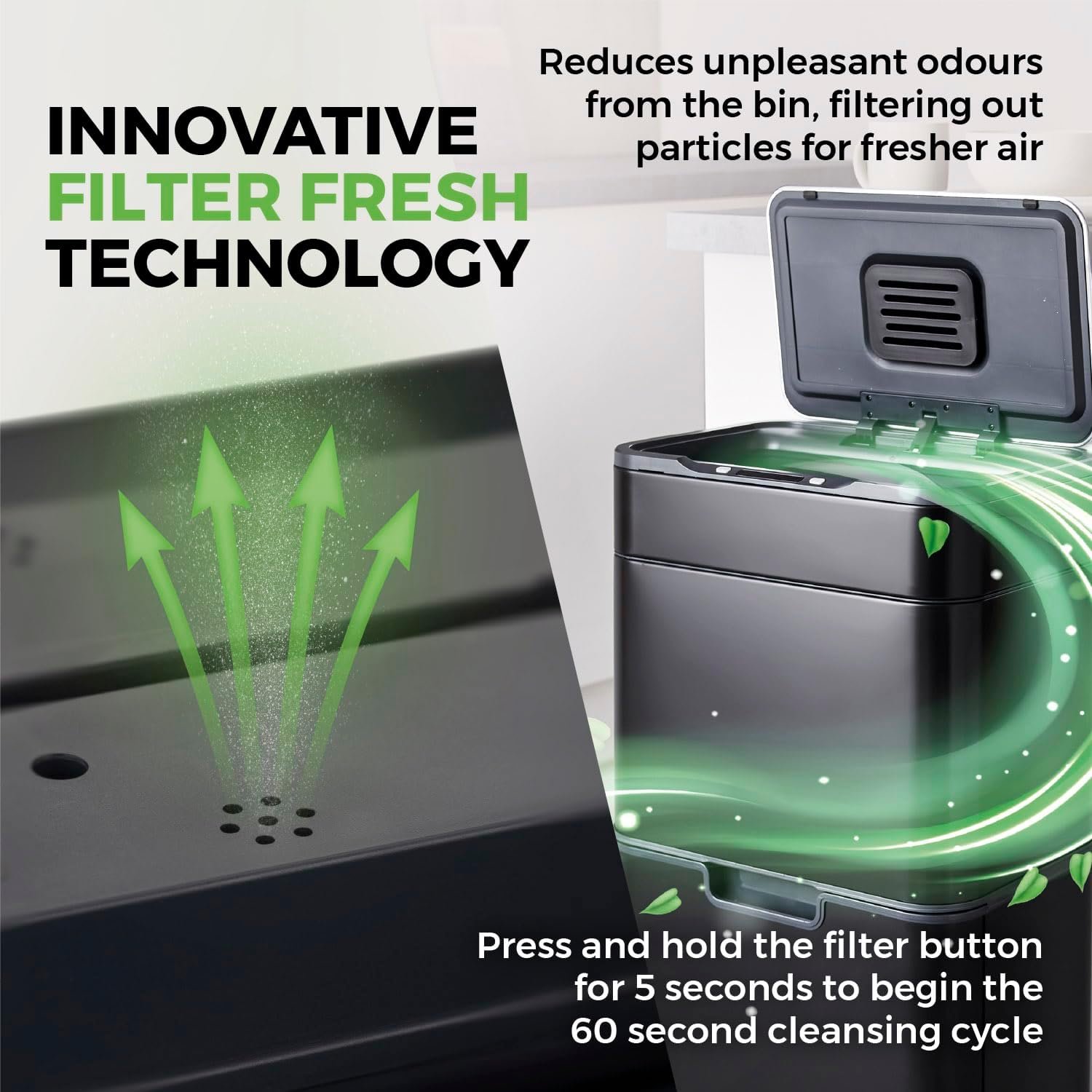 - OZONE FILTER FRESH TECHNOLOGY: Ozone Filter Fresh technology reduces unpleasant odours in the bin. filtering out particles for fresher air. Press and hold the button for five seconds with the bin lid closed. to begin the 60 second cycle. Technology within the bin lid has been specifically designed to eliminate bacteria & odours. ensuring a fresh & clean smelling environment.
